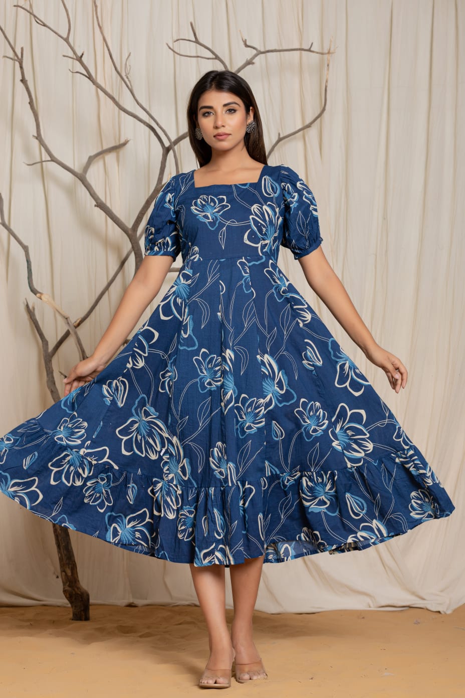 Effortlessly elegant and undeniably breezy, this blue-toned dress is a celebration of summer florals. Crafted from soft, breathable cotton, it features a flattering square neckline, puffed sleeves, and a flowing A-line silhouette that drapes beautifully with every step. The intricate floral print in shades of cream and blue adds a timeless charm, while the tiered hem gives it a playful twirl-worthy finish.