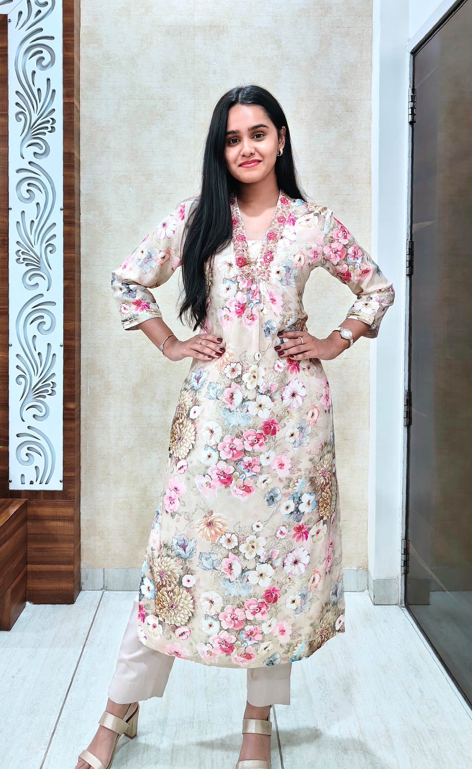 The kurta features delicate pastel floral prints and embellished neckline detailing with thread and bead embroidery. The cotton flex pants provide a structured yet breathable fit, making this outfit your ideal choice for day events, small gatherings, or festive celebrations.