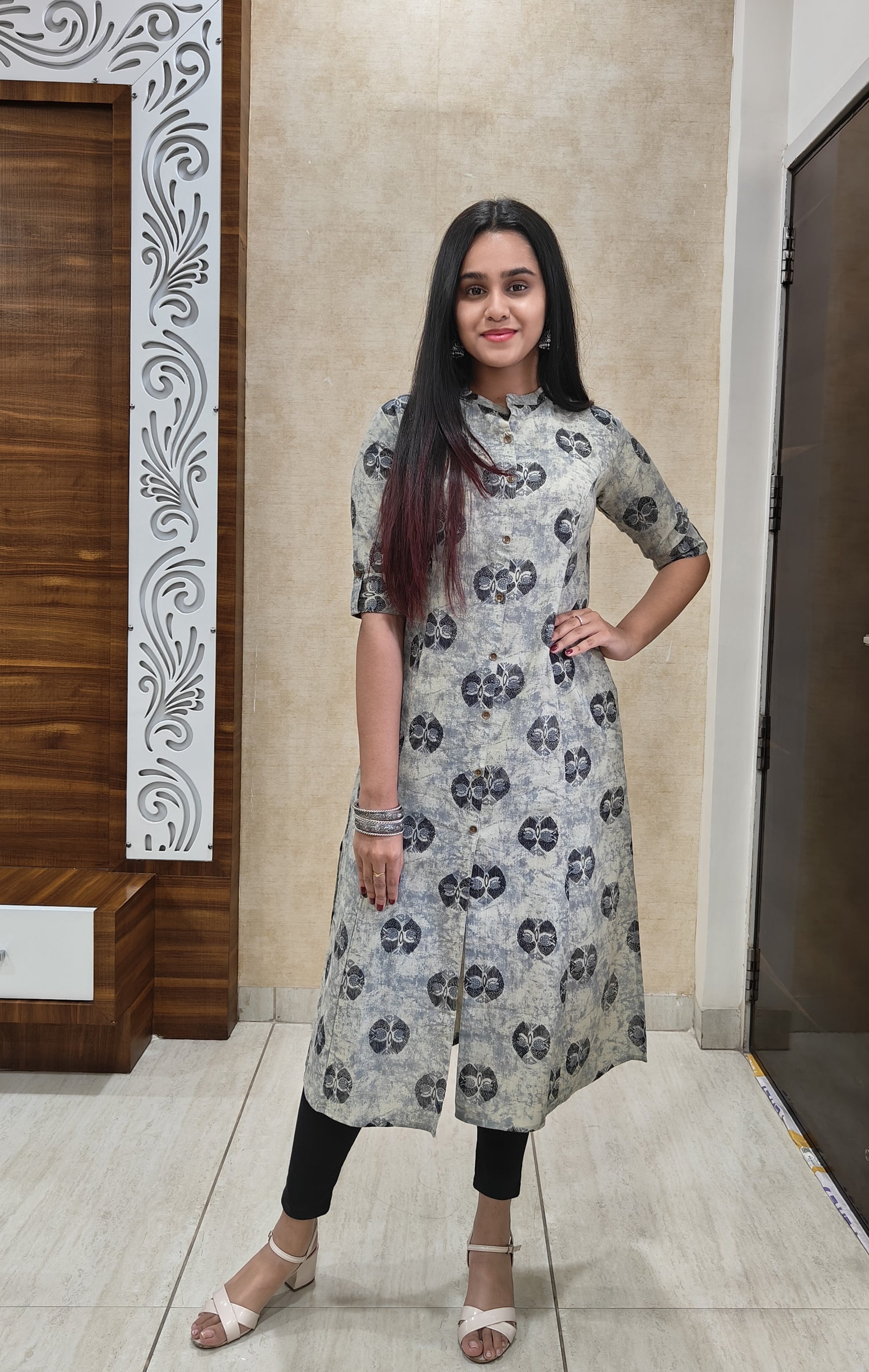 Grey Ajrakh Print Slub Cotton A Line Kurta