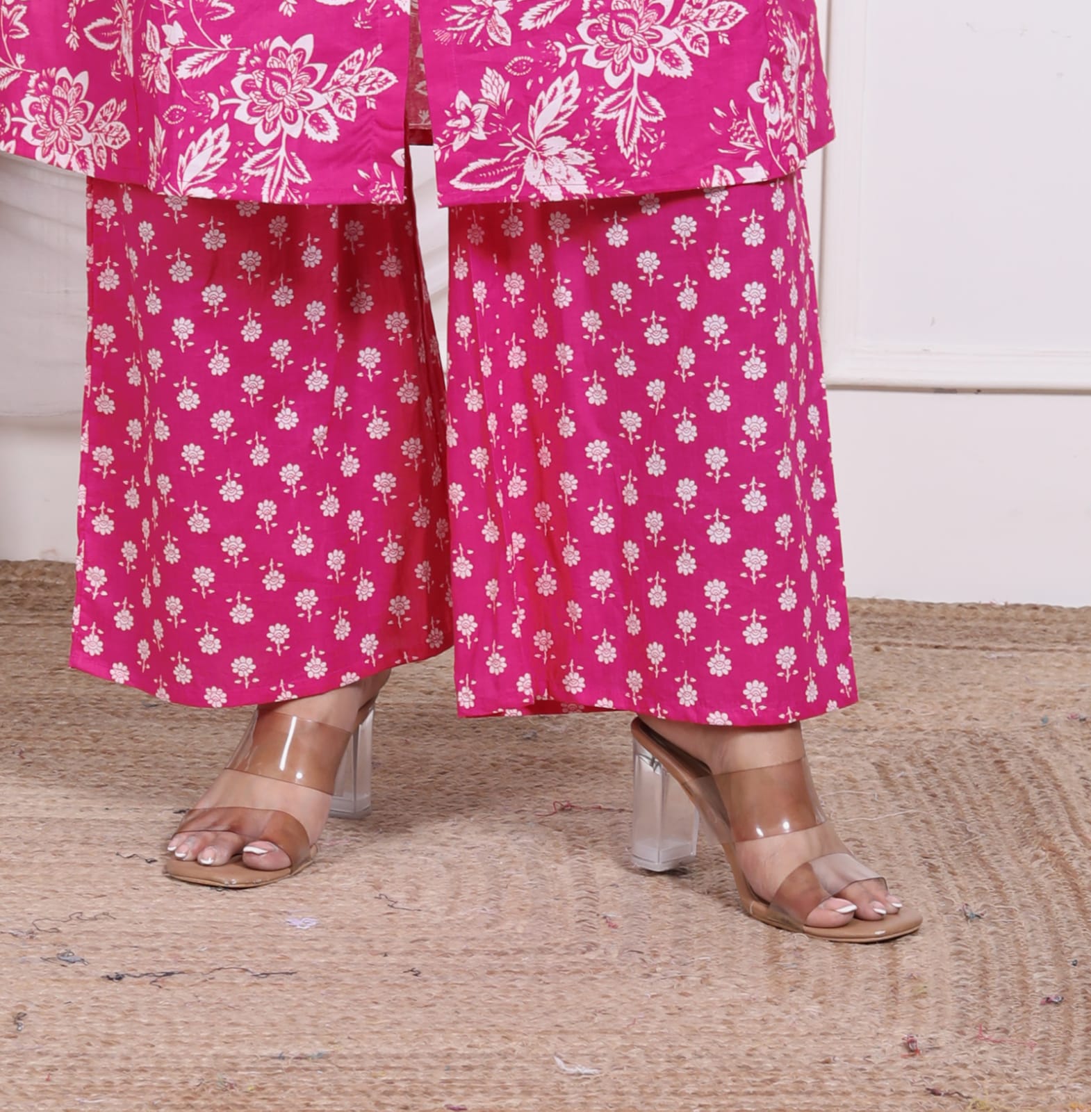 Hot Pink Floral Printed Pure Cotton Kurta Pant Set