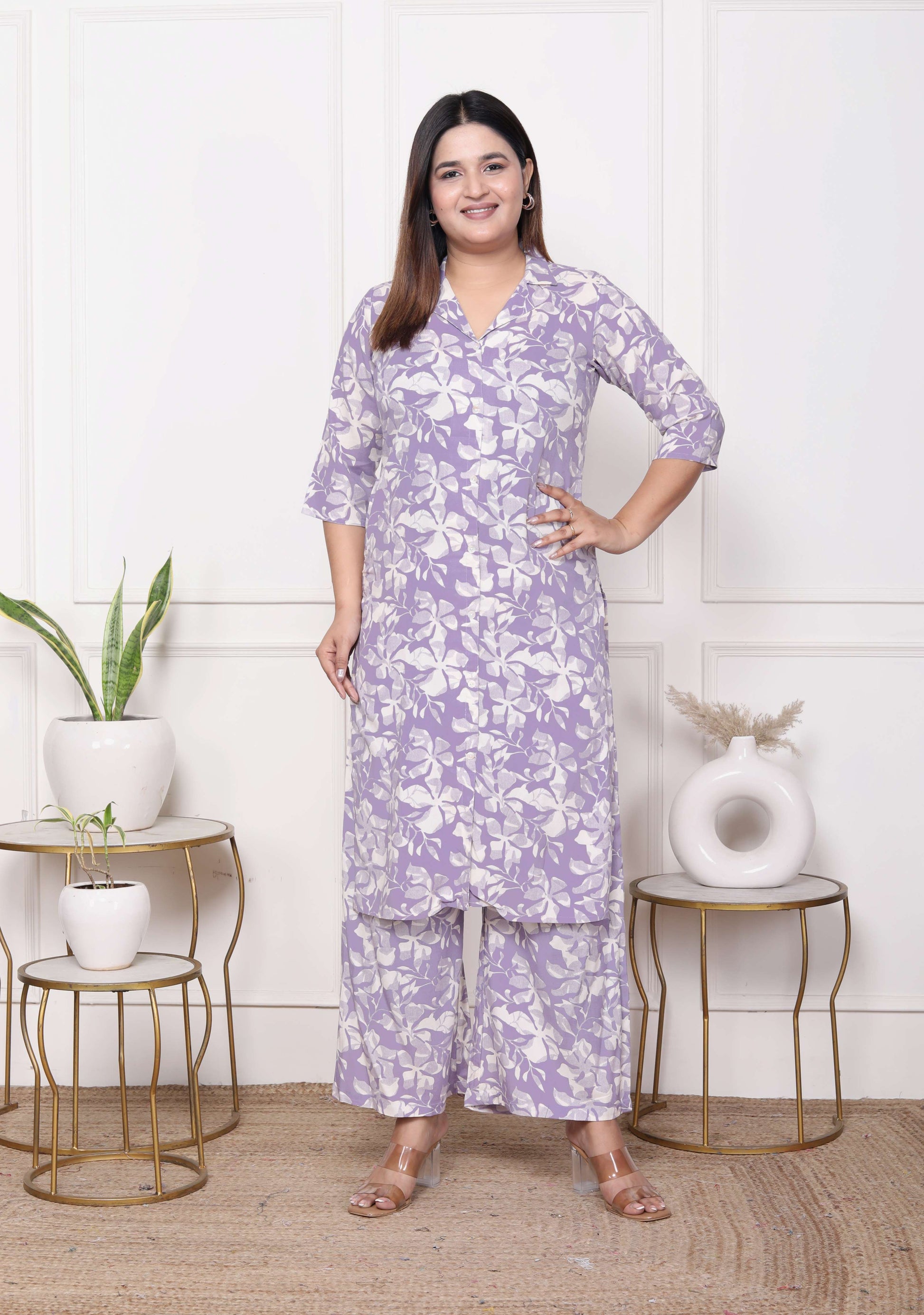 Step into effortless charm with this soothing lavender and white floral cotton co-ord set. Perfect for sunny days and breezy evenings, this two-piece ensemble includes a collared kurta with a straight cut and 3/4 sleeves, paired with wide-leg pants that ensure all-day comfort and easy movement.