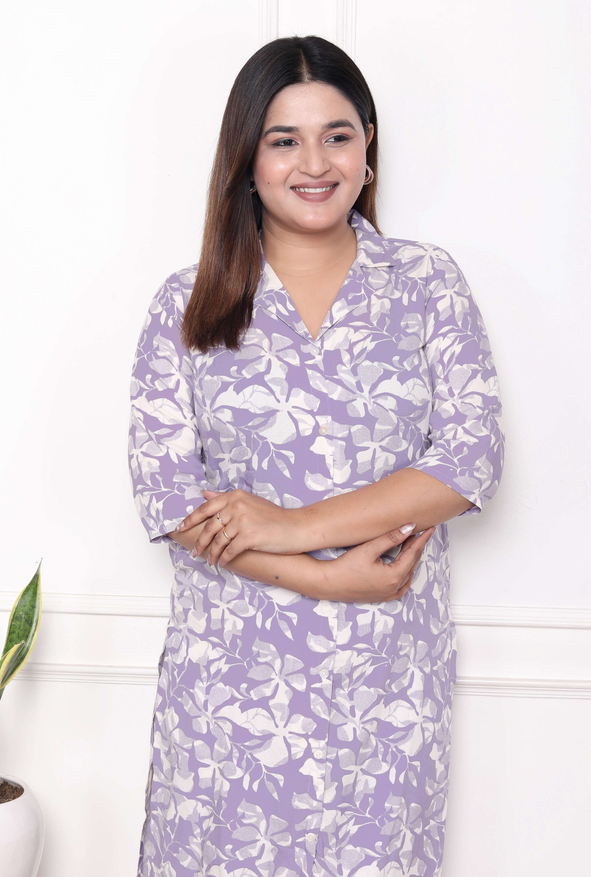 Made from breathable, pure cotton fabric, this set combines grace with everyday practicality. The soft lavender base is beautifully balanced with white botanical floral prints, making it an ideal pick for your casual outings, office looks, or work-from-home days.
