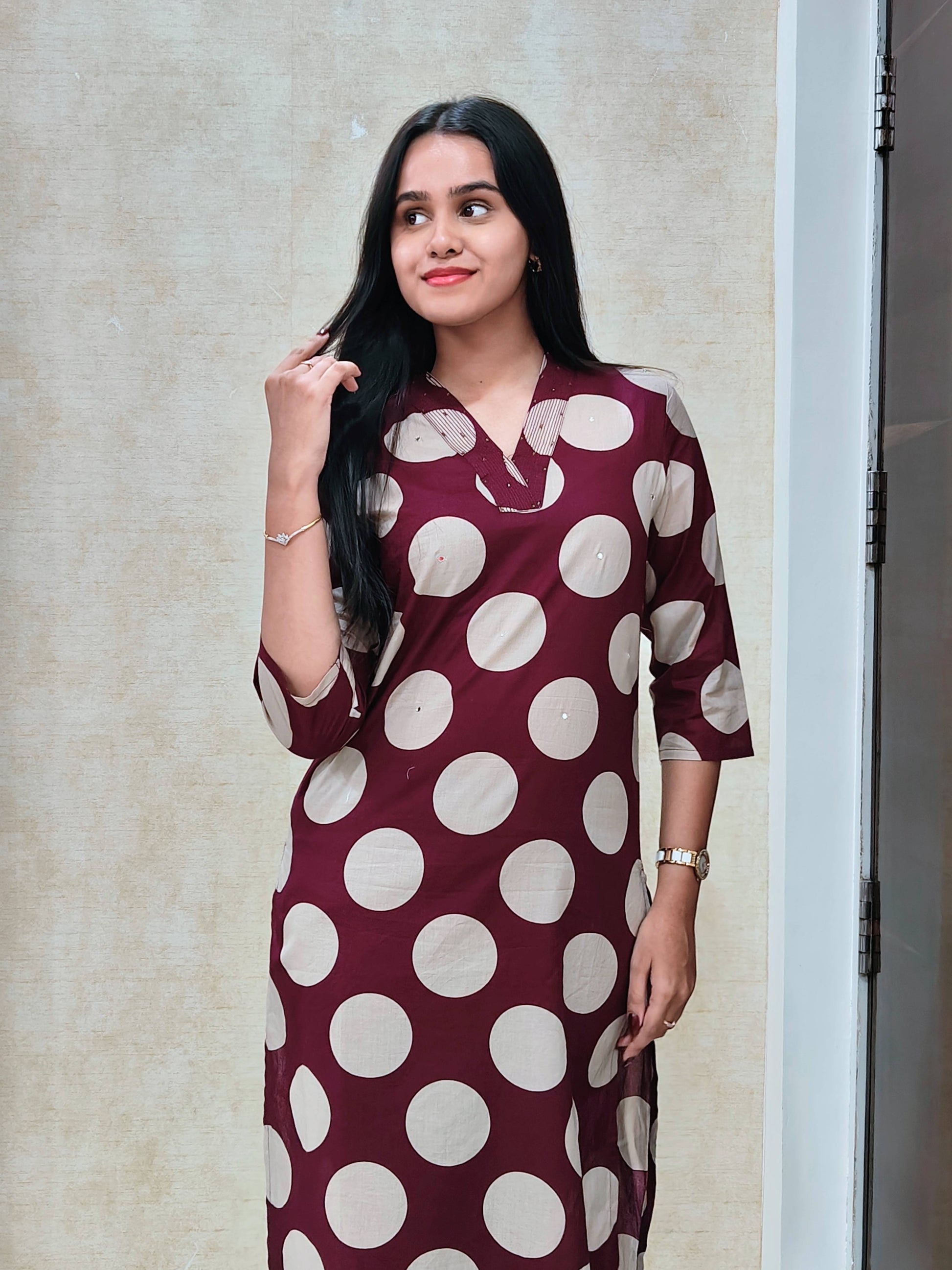 Step into comfort and confidence with our maroon polka dot kurta pant set crafted from 100% pure cotton. Designed for all-day wear, this set features a straight-fit kurta with bold beige polka prints, a smart V-neckline, and 3/4th sleeves — paired effortlessly with solid maroon cotton pants.
