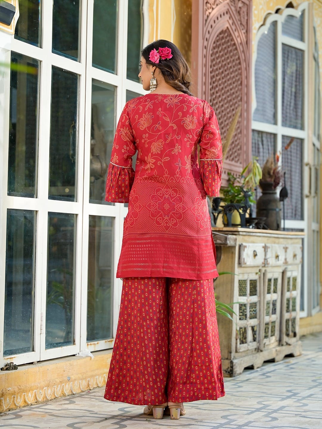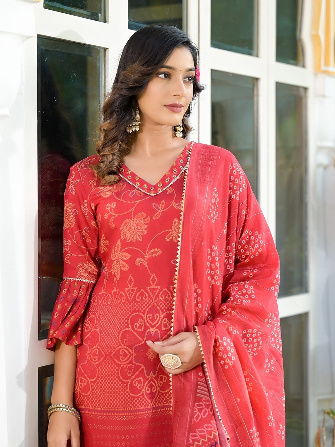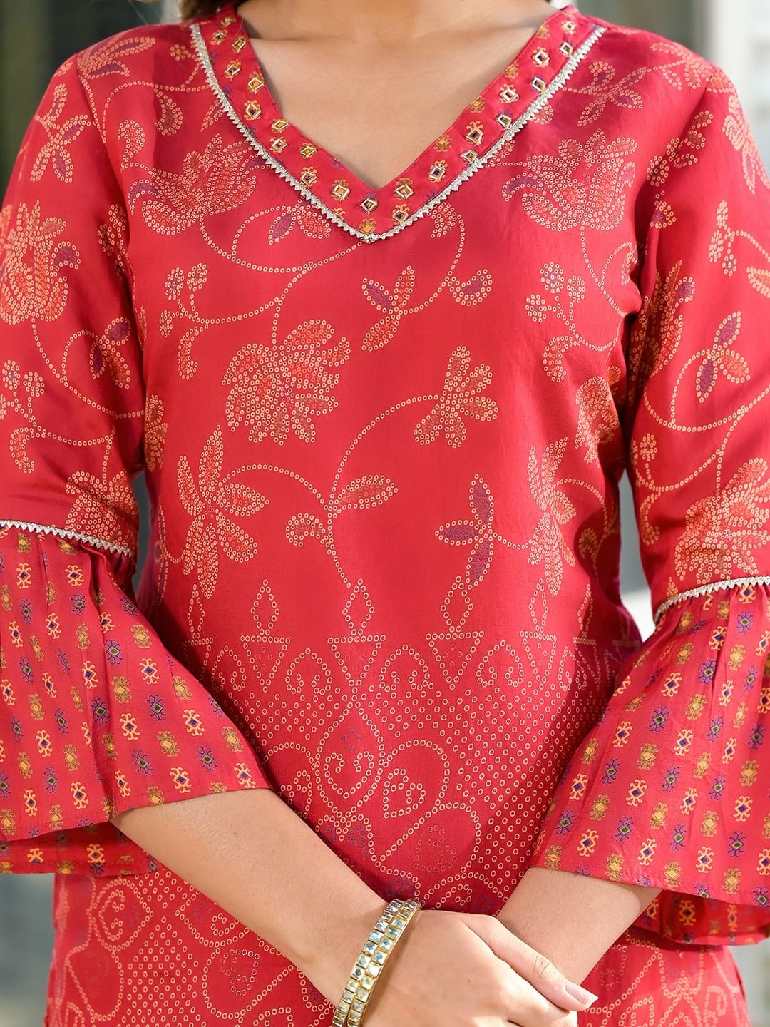 Elevate your ethnic charm with this exquisite red silk blend sharara set, crafted with traditional bandhani print and intricate lace work. The V-neck kurta features delicate thread motifs and a scalloped lace border, perfectly paired with a wide-leg sharara pant adorned in vibrant patterns. The coordinating dupatta adds a graceful finish with printed borders and soft drape.