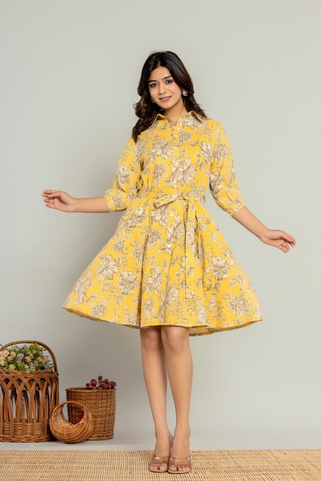 Bright, breezy, and beautifully tailored—this sunshine yellow floral dress is crafted from pure handloom cotton to keep you cool and stylish all day long. Featuring an elegant shirt collar, button-down front, and box pleats from waist to hem, the dress creates a charming flared silhouette that moves gracefully with every step.