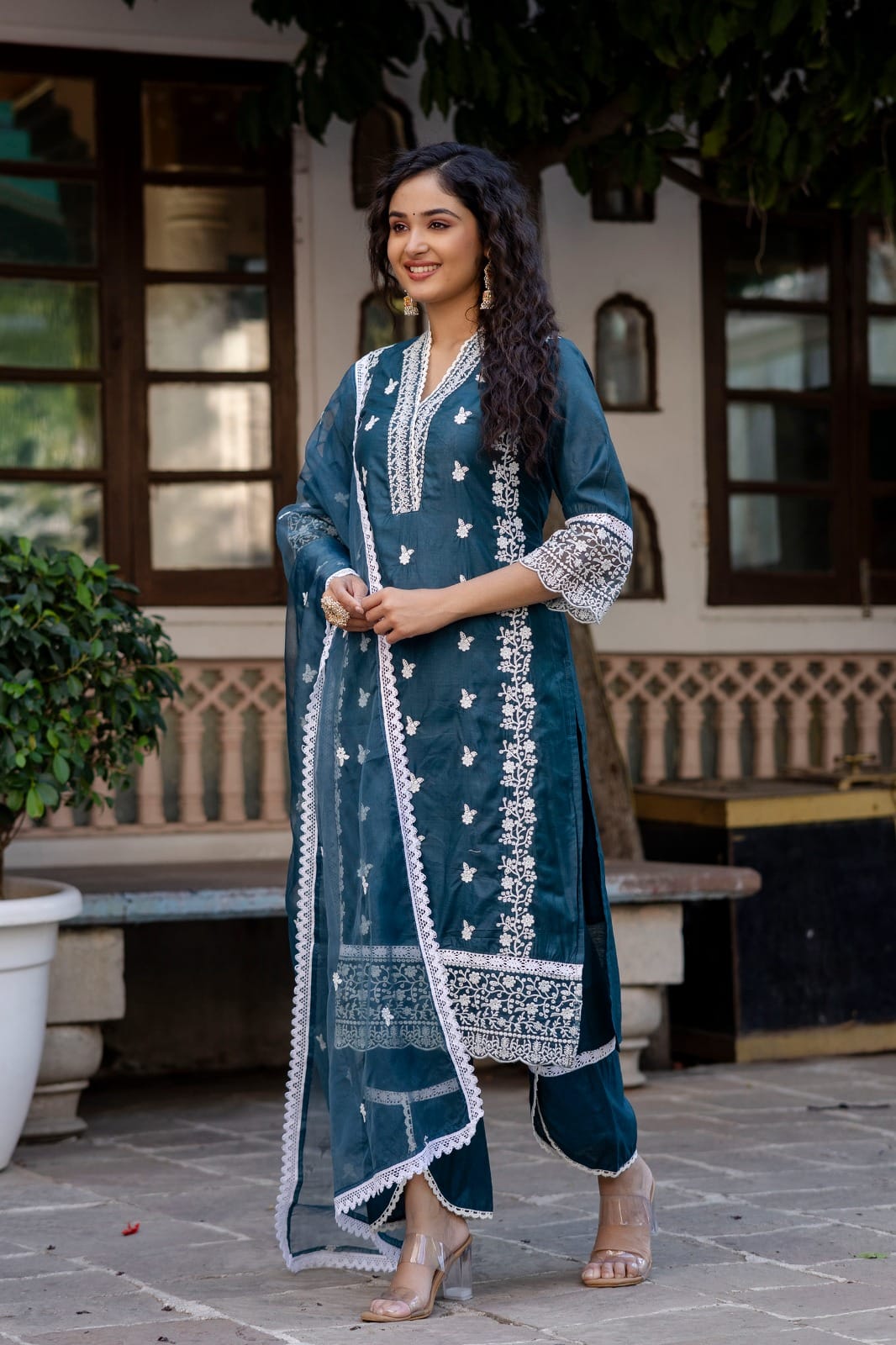 Elevate your ethnic wardrobe with this graceful teal blue suit set crafted from premium Chanderi fabric with soft cotton lining. Featuring intricate thread embroidery all over the kurta and pant, this ensemble speaks timeless elegance. The look is completed with a delicate organza dupatta embellished with floral thread motifs and lace border—perfect for festive mornings, pooja ceremonies, or day weddings.